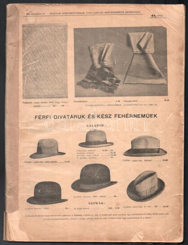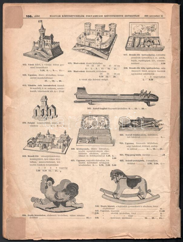 Beschreibung: 1928 Magyar Köztisztviselők Fogyasztási Szövetkezete értesítője. 1928. nov. 15. Fekete-fehér képekkel illusztrált katalógus, árjegyzék. Borító nélkül, sérült, hiányos, 39-156 p.