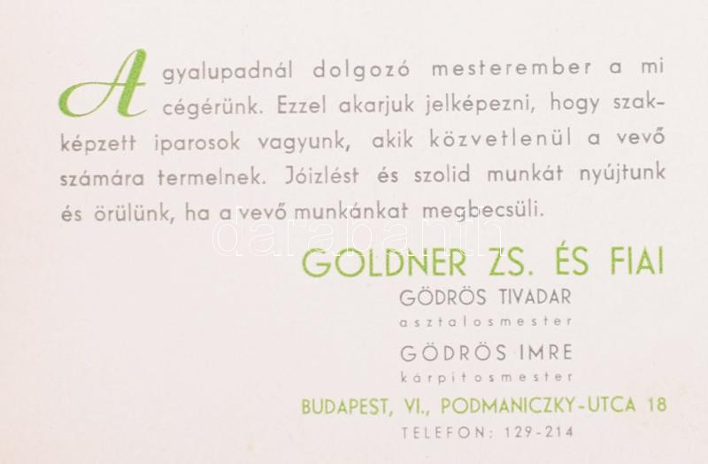 Goldner Zs. és Fiai Bp. VI. Podmaniczky u. 18. asztalos és kárpitosmes... https://www.darabanth.com/de/480-Fernauktion/480.0/Kunst-Dokumente-andere-Sammelgebiete/Werbungen~1500007/Goldner-Zs-es-Fiai-Bp-VI-Podmaniczky-u-18-asztalos-es-karpitosmesterek-prospektusa~II3282176