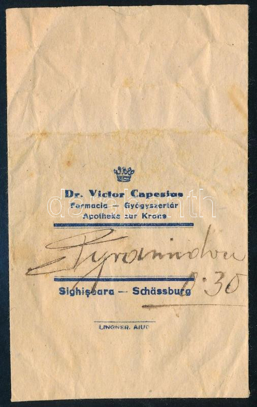 cca 1925 Segesvár gyógyszertári papírtasak dr. Victor Capesias gyógysz... https://www.darabanth.com/de/480-Fernauktion/480.0/Kunst-Dokumente-andere-Sammelgebiete/Werbungen~1500007/cca-1925-Segesvar-gyogyszertari-papirtasak-dr-Victor-Capesias-gyogyszertarabol-7x11-cm~II3281502