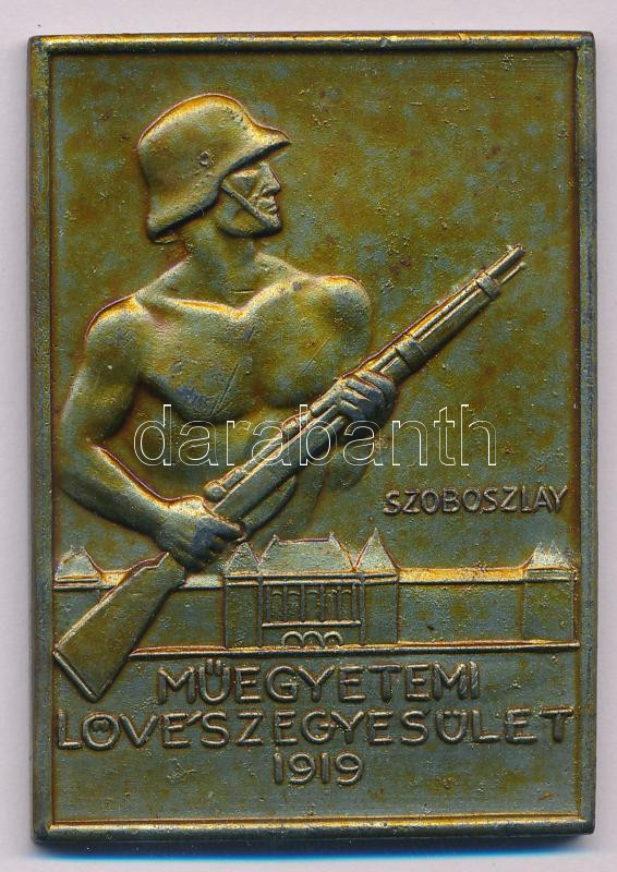 Beschreibung: 1943. "Műegyetemi Lövészegyesület 1919 " egyoldalas, bronz sportplakett, hátoldalon "1943 " gravírozással. Szign.: Szoboszlay (42x59mm) T:AU,XF