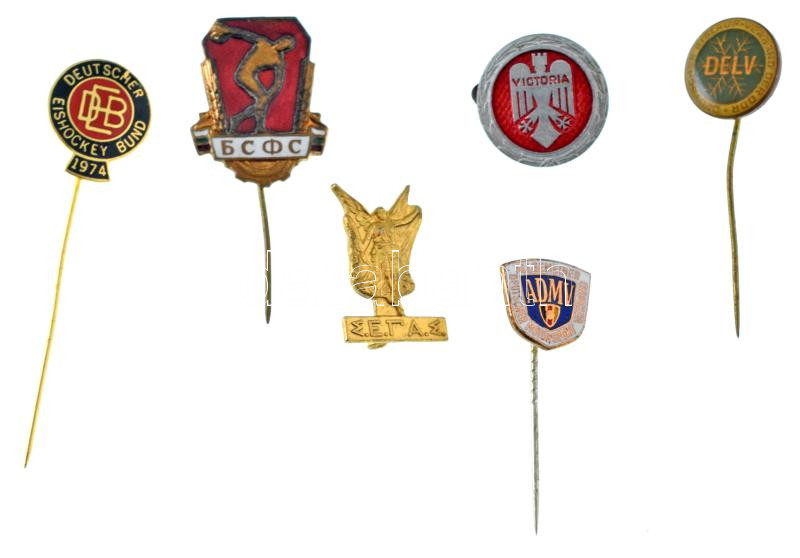 Beschreibung: 6db-os külföldi sportjelvény-tétel, közte "Német Jégkorong Szövetség" zománcozott bronz jelvény, "Victoria" autó-motor sportjelvény, "Görög Atlétikai Szövetség" aranyozott fém jelvény T:AU-VF