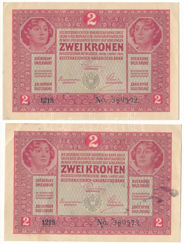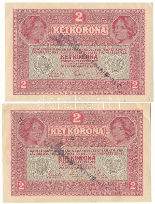 Beschreibung: 1917. 2K (2x) sorszámkövetők "1218 389572 - 1218 389573" felismerhetetlen fekete felülbélyegzéssel T:F, szép papír, folt