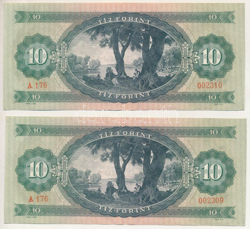 1969. 10Ft (2x) sorszámkövetők "A 176 002309 - A 176 002310" T:F szép ... https://www.darabanth.com/de/480-Fernauktion/480.0/Numismatik/Ungarische-Banknoten~2000009/1969-10Ft-2x-sorszamkovetok-A-176-002309-A-176-002310-T-F-szep-papir-Adamo-F7~II3264937