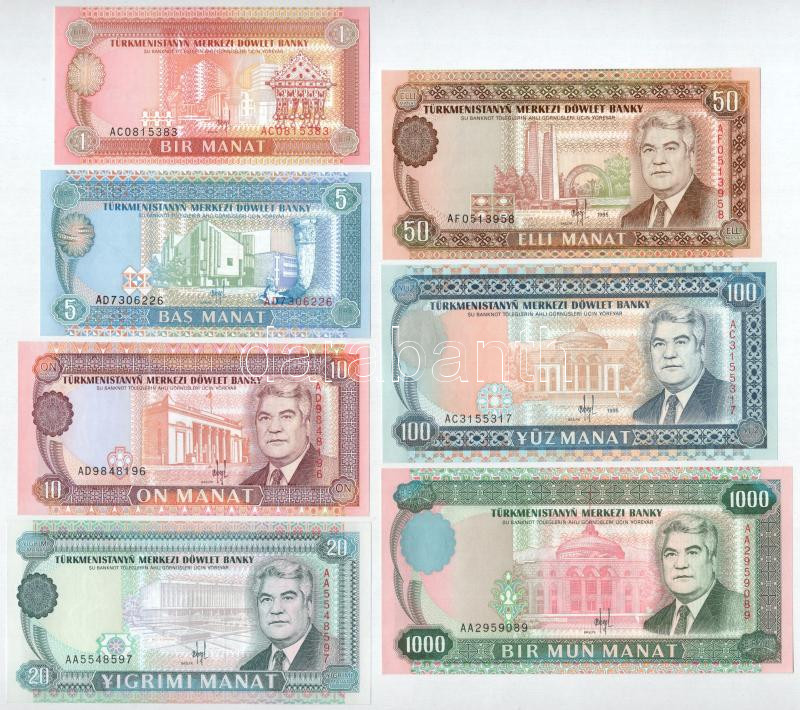 Turkmenistan ND(1993) 1 Manat - 20 Manat (4xdiff) + 1995. 50 Manat - 1000 Manat (3xdiff) C:UNC-AU, one of them wavy paper
