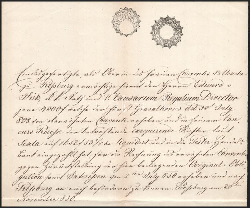Beschreibung: 1850 Pozsony (Pressburg) - Pest, 2G (2 Gulden) + 15kr szignettás okirat, viaszpecséttel
