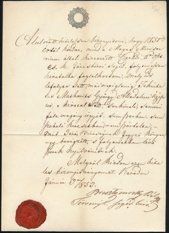 Beschreibung: 1859 Karád, 15kr szignettás bírósági okirat, viaszpecséttel