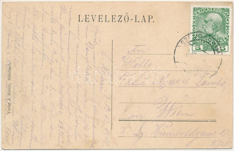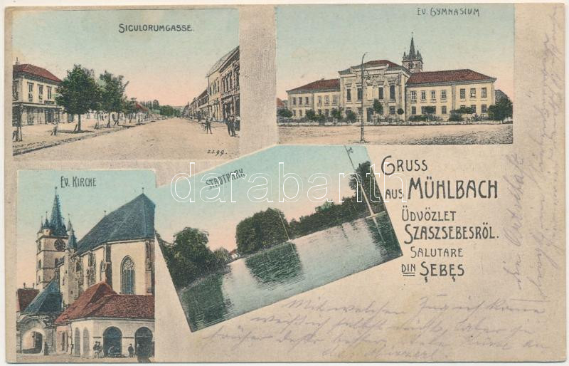 1914 Szászsebes, Mühlbach, Sebes; Siculorumgasse, Ev. Gymnasium und Kirche, Stadtpark / utca, Evangélikus templom és gimnázium, Városliget. J. Hientz kiadása / street, Lutheran church and school, park