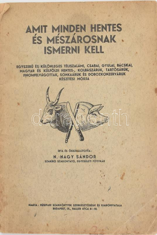 N. Nagy Sándor: Amit minden hentes és mészárosnak ismerni kell. Egyszerű és különleges téliszalámi, csabai, gyulai, bácskai, magyar és külföldi hentes-, kolbászáruk, tartósáruk, finomfelvágottak, sonkaáruk és dobozkonzerváruk készítési módja. Bp., [1938], Húsipari Szakkönyvek Kiadóhivatala (Held-ny.), 48 p. Kiadói papírkötés, kissé sérült, foltos borítóval, belül a lapok nagyrészt jó állapotban. Rendkívül ritka!
