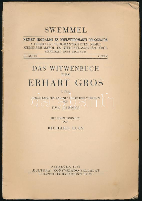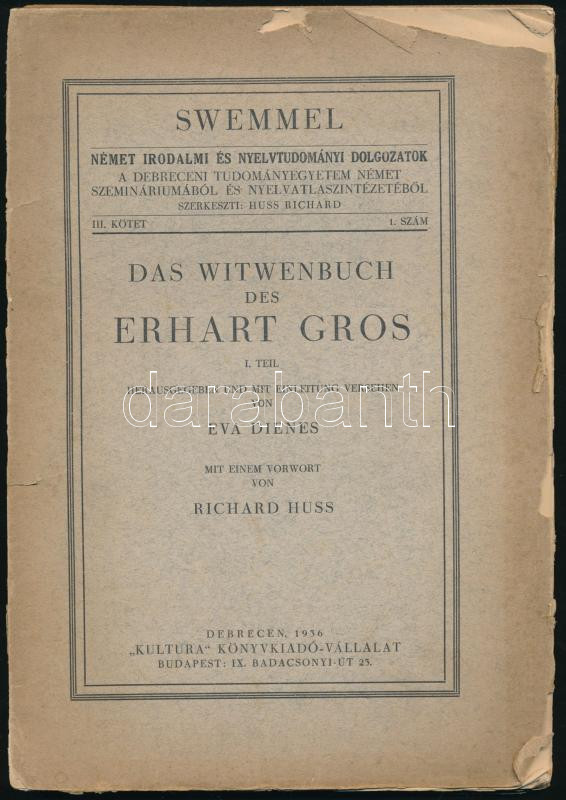 Dienes Éva (szerk.): Das Witwenbuch des Erhart Gros I. Teil. Herausgegeben und mit Einleitung versehen von Eva Dienes. Mit einem Nachwort von Richard Huss. Debrecen, 1936, "Kultura". XIX+80 p. Német nyelven. Kiadói papírkötésben, felvágatlan lapokkal, sérült gerinccel, sérült borító két részben elvált a könyvtesttől. Csak az I. kötet! Debrecenben őrzött, német ny. kódex.