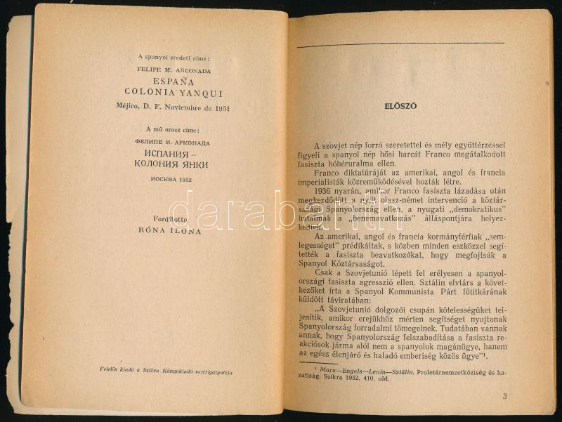 Felipe M. Arconada: Spanyolország, a jenkik gyarmata. Ford.: Róna Ilon... https://www.darabanth.com/de/481-Fernauktion/481.0/Bucher/Bucher-Geschichte~2000021/Felipe-M-Arconada-Spanyolorszag-a-jenkik-gyarmata-Ford-Rona-Ilona-Bp-1953-Szikra-Kiadoi~II3287464