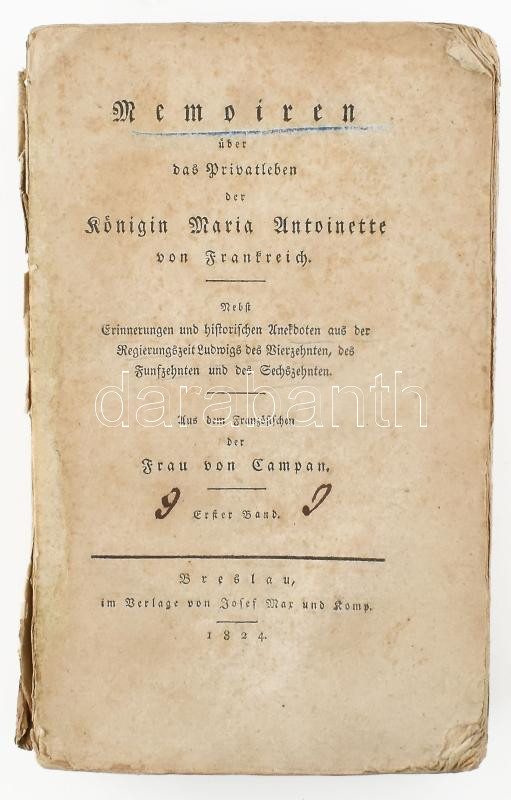 Jeanne Louise Henriette Campan: Memoiren über das Privatleben der Königin Maria Antoinette von Frankreich. Nebst Erinnerungen und historischen Anekdoten aus der Regierungszeit Ludwigs des Vierzehnten, des Fünfzehnten und des Sechzehnten; Aus dem Französischen der Frau von Campen, Erster Band. Breslau, 1824. Joseph Mar und Komp. 334p.Fűzve, kiadói papírborítóban