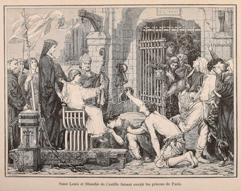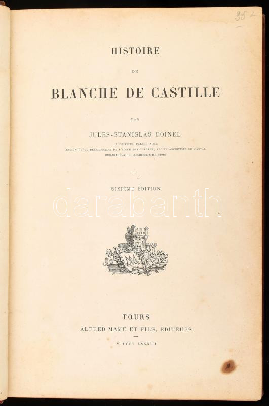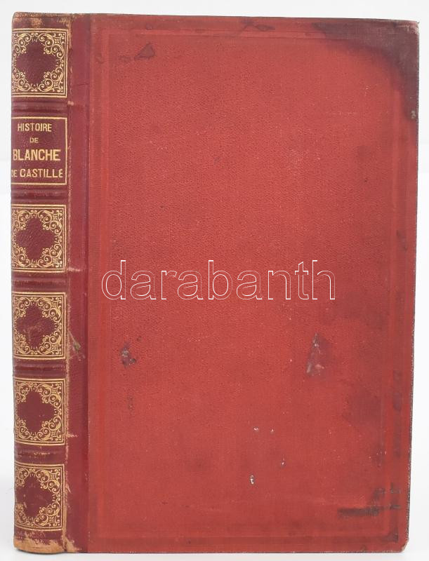 Jules-Stanislas Doinel: Histoire de Blanche de Castille. [Kasztíliai Blanka története.] Tours, 1883, Alfred Mame et Fils, 1 t.+368 p.+7 t. Francia nyelven. Szövegközti és egészoldalas fekete-fehér képanyaggal illusztrált. Korabeli aranyozott gerincű félbőr-kötés, aranyozott lapélekkel, kopott borítóval, foltos borítóval és foltos lapokkal.