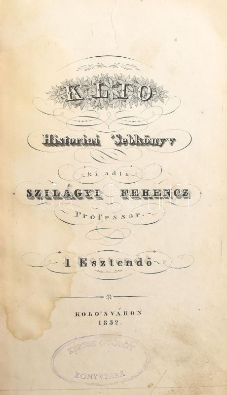 Klio. Historiai' Sebkönyv. I. Esztendő. Kiadta Szilágyi Ferencz Professor. Kolo'sváron, 1832, Évanglica Réformátum Kollégyom,(Barra Gábor-ny.), 2 p.+1 (díszcímlap) t.+8+VI+376+18 p. + 1 (Lengyel-ország kőbe metszett Föld-abroszsza. Rajzolta és kőre metszette: Kovács Jósef, kihajtható, határszínezett térkép, szakadt, 20x22 cm.) t. Első kiadás. Korabeli kartonált papírkötés, kopott, foltos borítóval, sérült gerinccel, javított kötéssel, foxing foltos lapokkal, a térkép szakadt, possessori bélyegzéssel és névbejegyzéssel, egy oldalszámozás nyomdahibás (IV helyett VI.)