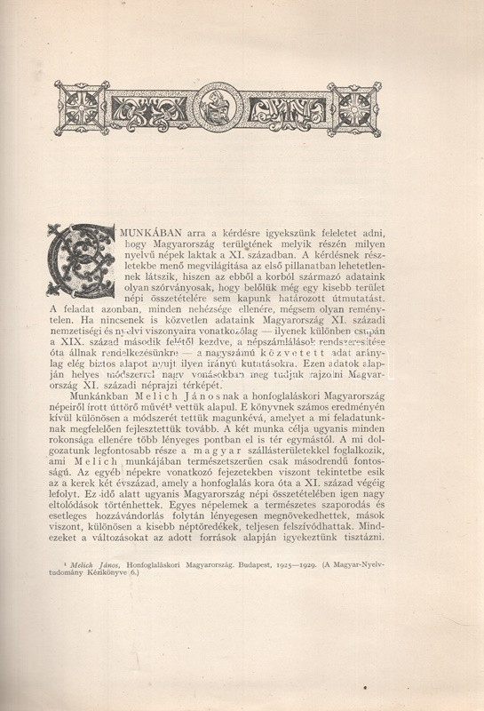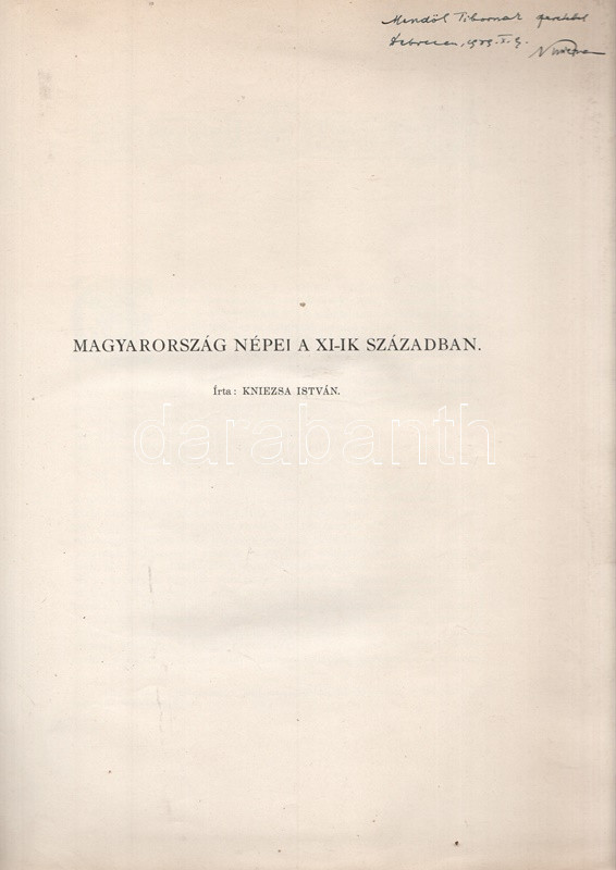 Kniezsa István: Magyarország népei a XI-ik században. (Dedikált.) Budapest, 1938. (Szerző - Franklin-Társulat ny.) [2] + [367]-472 p. + 1 térkép (színes, kihajtható). Első kötetkiadás. Dedikált: "Mendöl Tibornak szeretettel: Kniezsa István. Debrecen, 1959. X. 9." Kniezsa István (1898-1965) nyelvész, nyelvtörténész, szlavista nyelvészeti kutatása az alaposan átpolitizált témát régészeti, nyelvészeti módszerrel járja körül. A tanulmány a honfoglalás utáni időben nyugaton egybefüggő, kelet felé haladva egyre inkább szigetszerűvé váló szláv jelenlétet azonosít a Felvidék folyóvölgyeiben. A szerző további szláv jelenlétet azonosít az Alföld egyes területein, a különösen ritkásan lakott Erdélyben viszont a magyarság lassú belső vándorlását vélelmezi, és kijelenti, hogy Erdély számos területen lassú vándoslása ellenére is a magyarság a térség első birtokba vevője, helységeinek a magyarság az első névadója, a románság lényegesen későbbi jövevénynek számít. A munka a XI. századi ország területén még törökös-bolgár, illetve germán népességgel is számol. A kötet végén a dolgozat etnikai tanulságait jól összefoglaló térképmelléklet. Prov.: Mendöl Tibor. [Mendöl Tibor (1905-1966) geográfus, egyetemi tanár, a hazai településföldrajz meghatározó szakértője.] (Különlenyomat az Emlékkönyv Szent István halálának kilencszázadik évfordulóján c. mű II. kötetéből.) Fűzve, enyhén sérült kiadói borítóban, a hátsó fedőborító elvált a könyvtesttől.