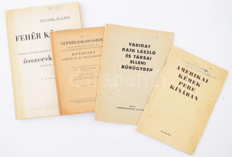 Beschreibung: Szocreál jogász tétel: 1945 A NépbÃráskodásról szóló 81/1945 sz rendelet szövege és magyarázata, Vádirat Rajk László és társai elleni bűnügyben, Amerika kémek pere KÃnában. Fehér könyv - A magyar köztársaság és demokrácia elleni összeesküvés okmányai II. kiad.