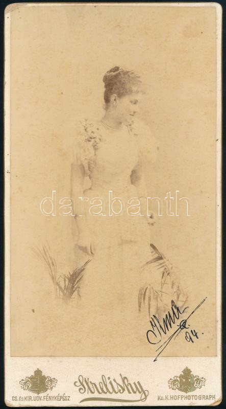 Beschreibung: 1894 Jeszenszky Ilma portréja, keményhátú fotó Strelisky budapesti műterméből, 20,5×11 cm
