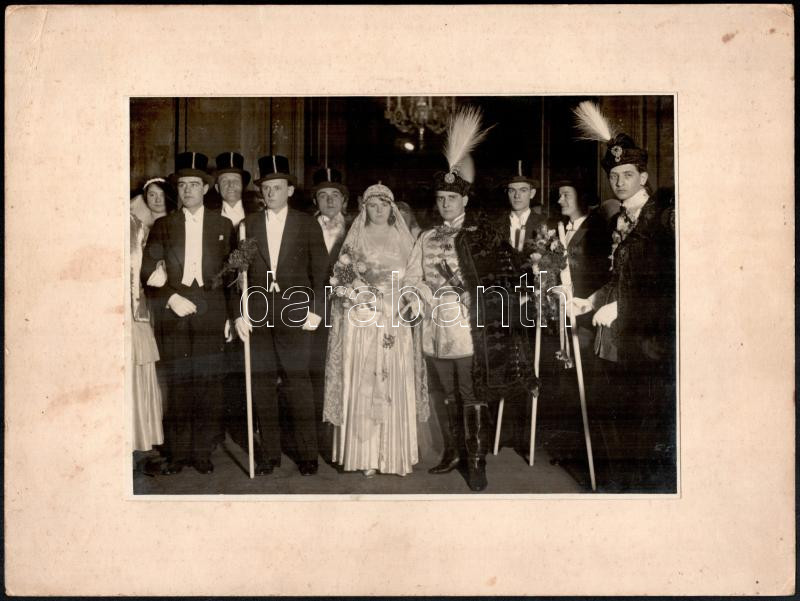 1930 Báró magyargyerőmonostori Kemény Boldizsár (1908-1983) közgadász díszmagyaros és kiskámoni Szalay Magdolna esküvői fotója, a szélén szintén díszmagyarban, Báró Kemény Gábor (1910-1946) katonatiszt, jogász, publicista, főszolgabíró, későbbi nyilas politikus, a Szálasi-kormány külügyminisztere, fotó kartonon, Macsi András budapesti műterméből, 17x23 cm