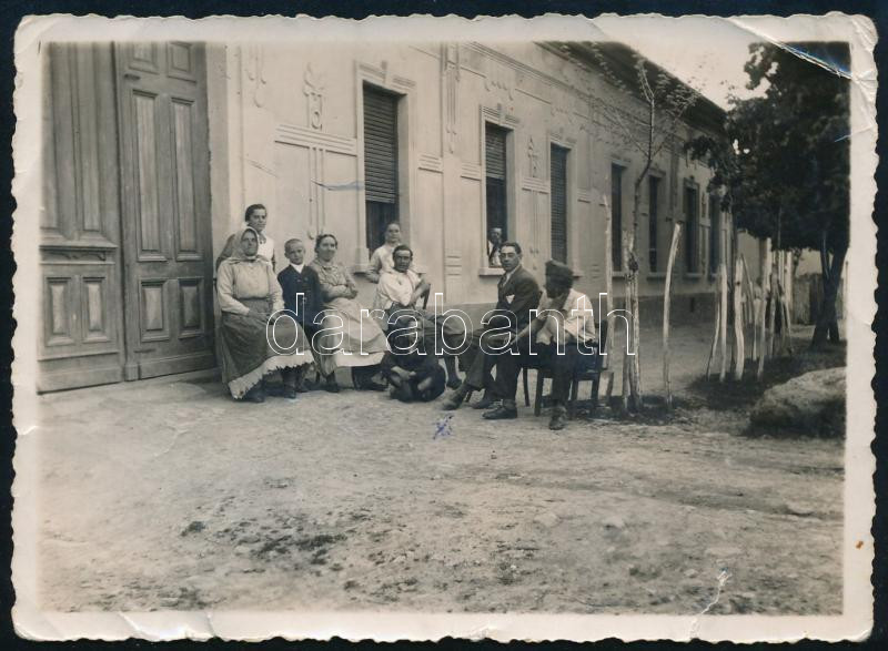 Beschreibung: 1937 Gyergyósolymos, baráti társaság egy ház előtt, hátoldalon feliratozott, sérült fotó, 8×11 cm