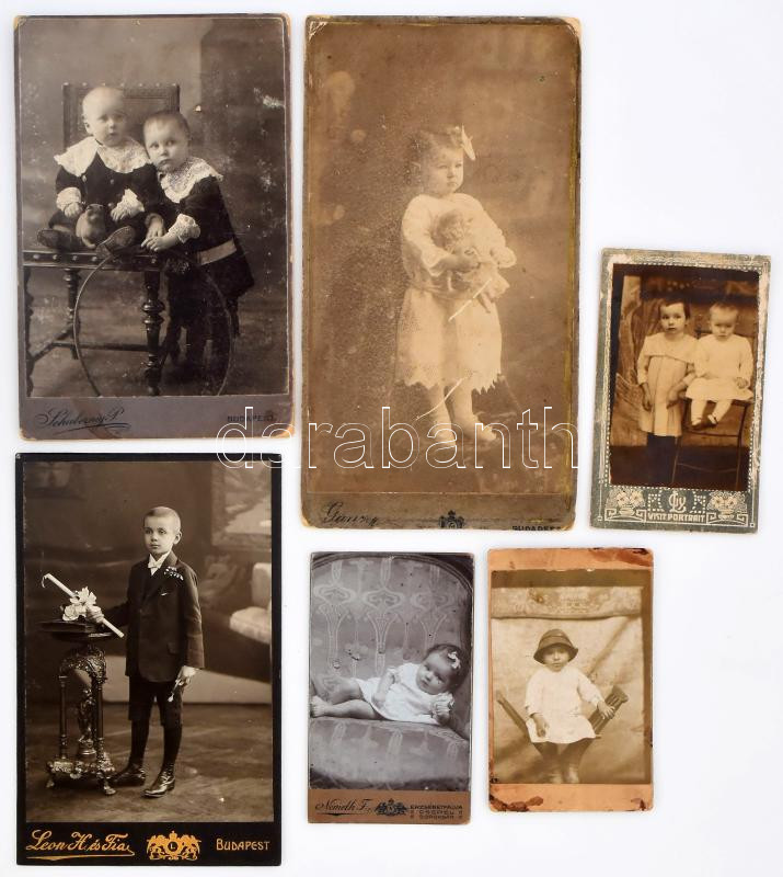 cca 1890-1910 Baba- és gyerekportrék, 6 db keményhátú fotó, klf. budapesti, ill. jelzés nélküli műtermekből, változó állapotban, 10,5x6,5 cm és 20x11 cm között