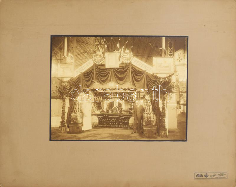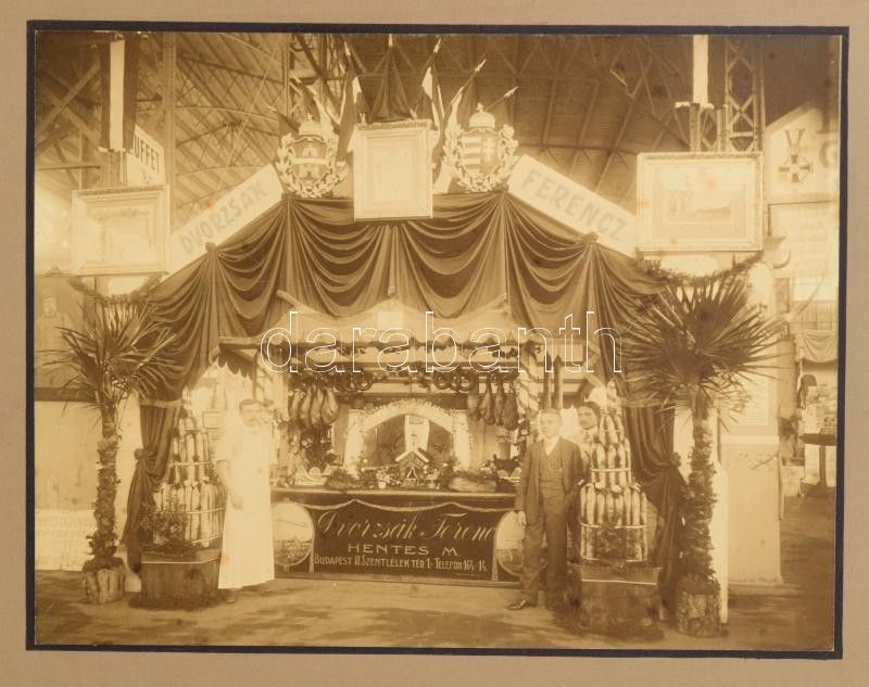 cca 1896 Dvorzsák Ferenc óbudai hentes mester feldíszített pavilonja a millenniumi (?) kiállításon, nagy méretű fotó kartonon Erdélyi Mór műterméből,a karton háta foltos, fotó: 23x30 cm, karton: 42x52,5 cm