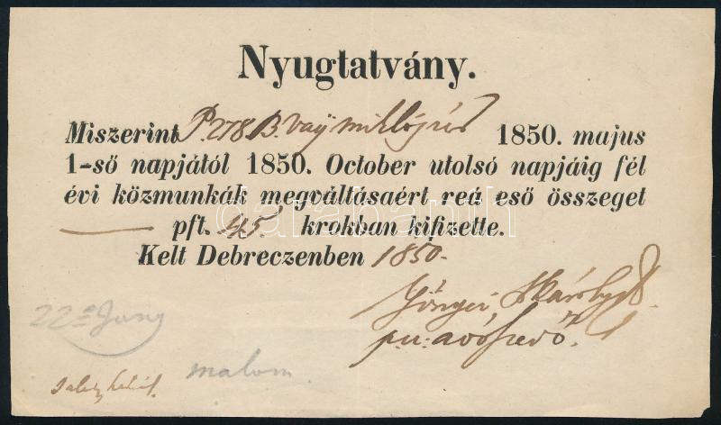 1850 Debrecen Nyugtatvány közmunkák megváltásáért fizetendő összegről https://www.darabanth.com/de/481-Fernauktion/481.0/Kunst-Dokumente-andere-Sammelgebiete/Dokument~1500021/1850-Debrecen-Nyugtatvany-kozmunkak-megvaltasaert-fizetendo-osszegrol~II3289055