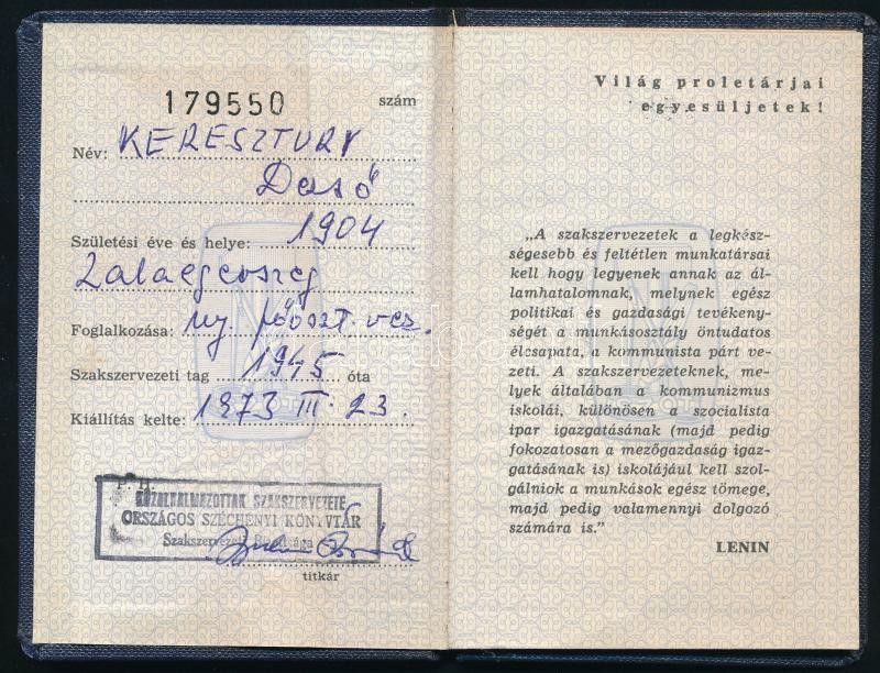 Beschreibung: 1973 Keresztury Dezső (1904-1995) író, költő, korábbi vallás- és közoktatásügyi miniszter szakszervezeti tagsági könyve
