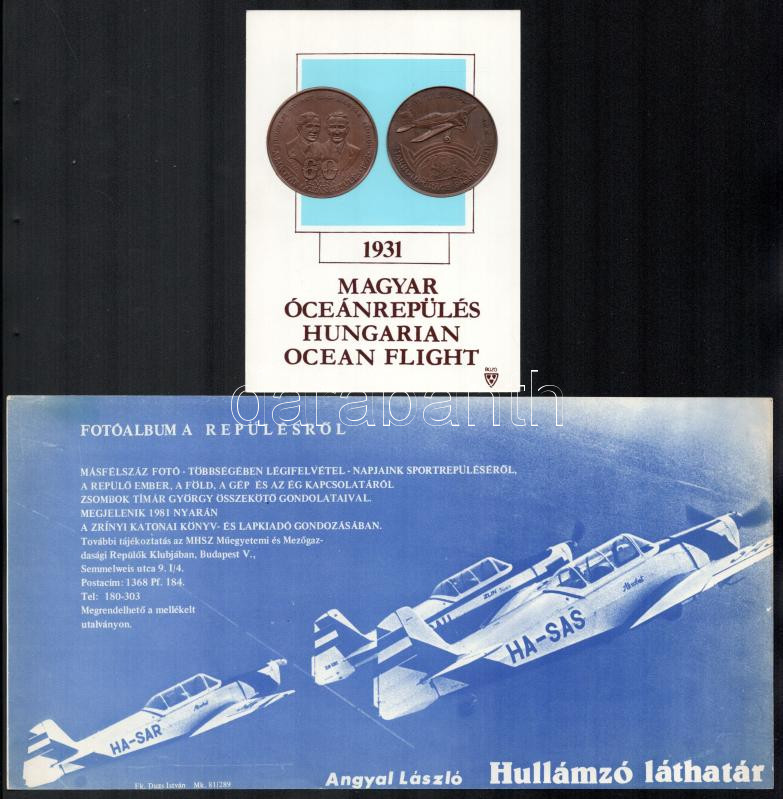 1991 "60 éves a magyar óceánrepülés" 1931-1991 (Endresz György - Magyar Sándor) fém éremmel díszített emléklap + Angyal László: Hullámzó láthatár, fotóalbum a repülésről, könyvismertető reklámlap