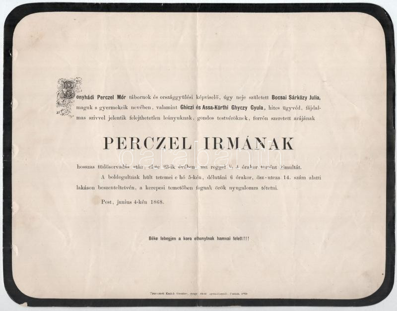 1868 Pest, Perczel Irma (1845-1868) Perczel Mór lányának halálozási ér... https://www.darabanth.com/de/481-Fernauktion/481.0/Kunst-Dokumente-andere-Sammelgebiete/Drucksachen~2000013/1868-Pest-Perczel-Irma-1845-1868-Perczel-Mor-lanyanak-halalozasi-ertesitoje~II3290739