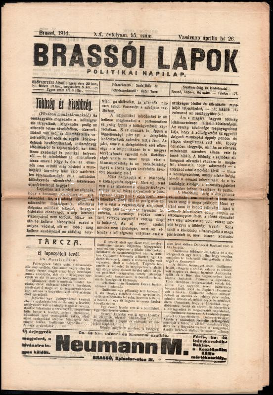 1914 A Brassói lapok c. folyóirat XX. évf. 95. szám benne a többség és... https://www.darabanth.com/de/481-Fernauktion/481.0/Kunst-Dokumente-andere-Sammelgebiete/Drucksachen~2000013/1914-A-Brassoi-lapok-c-folyoirat-XX-evf-95-szam-benne-a-tobbseg-es-kisebbsegrol-szolo-cikkel~II3246556