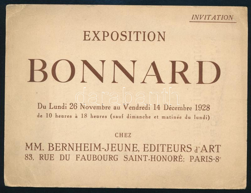 1928 Pierre Bonnard (1867-1947) festőművész kiállítására szóló meghívó, Párizs, MM. Bernheim-Jeune, hátoldalán Szittya Emil (1886?1964) költő, író, művészetkritikus és festő aláírásával, hajtásnyommal