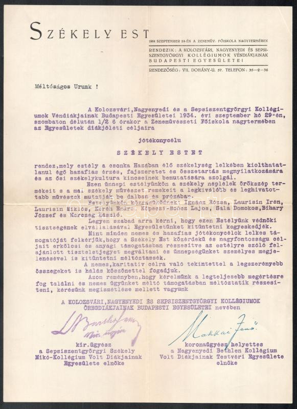 1934 Bp., a Kolozsvári, Nagyenyedi és Sepsiszentgyörgyi Kollégiumok Vé... https://www.darabanth.com/de/481-Fernauktion/481.0/Kunst-Dokumente-andere-Sammelgebiete/Drucksachen~2000013/1934-Bp-a-Kolozsvari-Nagyenyedi-es-Sepsiszentgyorgyi-Kollegiumok-Vendiakjainak-Budapesti~II3288497