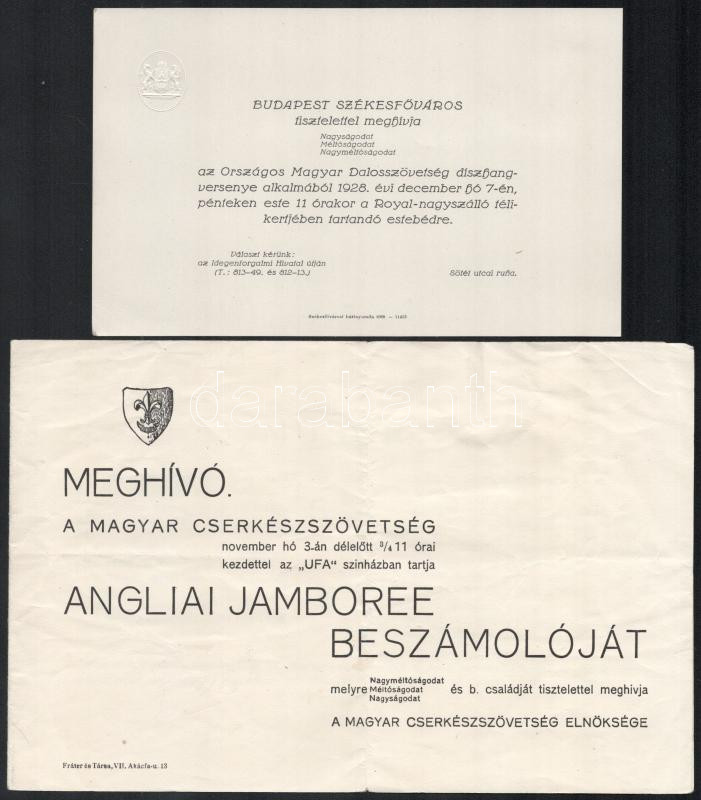 Beschreibung: ca 1927 Magyar Cserkésszövetség beszámoló levél angliai jamboreeról + Magyar dalosszövetség meghívó hangversenyre