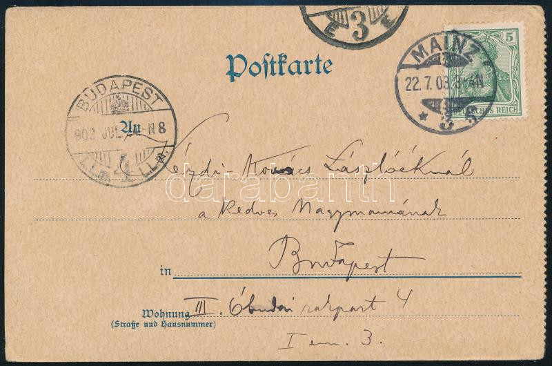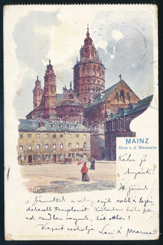 Beschreibung: 1903 Kézdi-Kovács László (1864-1942) festőművész, műkritikus személyes hangvételű autográf sorai Mainz-i képeslapon