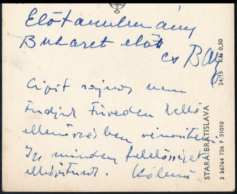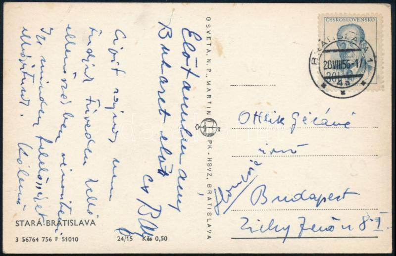1956 Ottlik Gézáné, Ottlik Géza (1912-1990) író, műfordító felesége részére küldött képeslap Pozsonyból, azonosítandó aláírásokkal