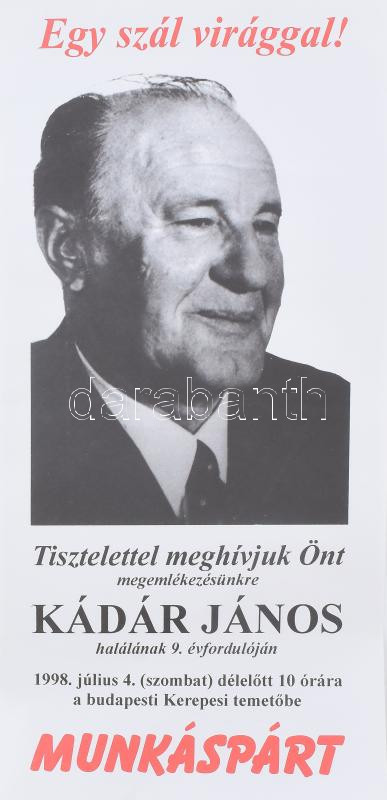 1998 "Egy szál virággal!" - meghívó plakát Kádár János megemlékezésre,... https://www.darabanth.com/de/481-Fernauktion/481.0/Kunst-Dokumente-andere-Sammelgebiete/Plakat~2000014/1998-Egy-szal-viraggal-meghivo-plakat-Kadar-Janos-megemlekezesre-Munkaspart-42x20-cm~II3290875