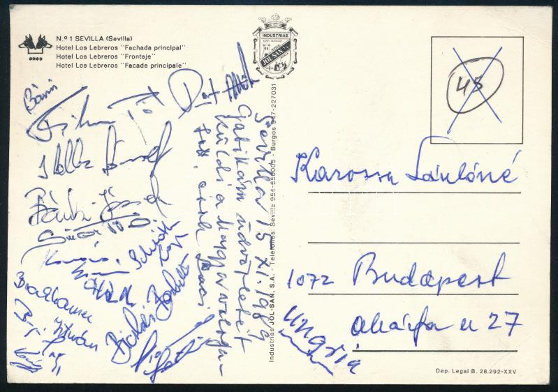 1989 Magyar labdarúgó felnőtt válogatott aláírásai: Simon Tibor, Keller József, Bicskei Bertalan, Kovács Ervin, Pintér Attila, Bánki József stb., össz. 15 autográf aláírással, Karossa László (1910-1992) fotóriporternek, a Magyar Labdarúgó Szövetség első hivatalos fotográfusának címezve, Sevillaból a Spanyolország-Magyarország világbajnoki válogatott mérkőzés alkalmából.