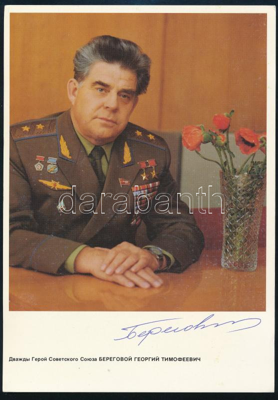 Georgij Tyimofejevics Beregovoj (1921-1995) szovjet űrhajós autográf aláírása őt ábrázoló képen / Autograph signature of Georgy Timofeyevich Beregovoy (1921-1995) Soviet cosmonaut on a card 15x21 cm