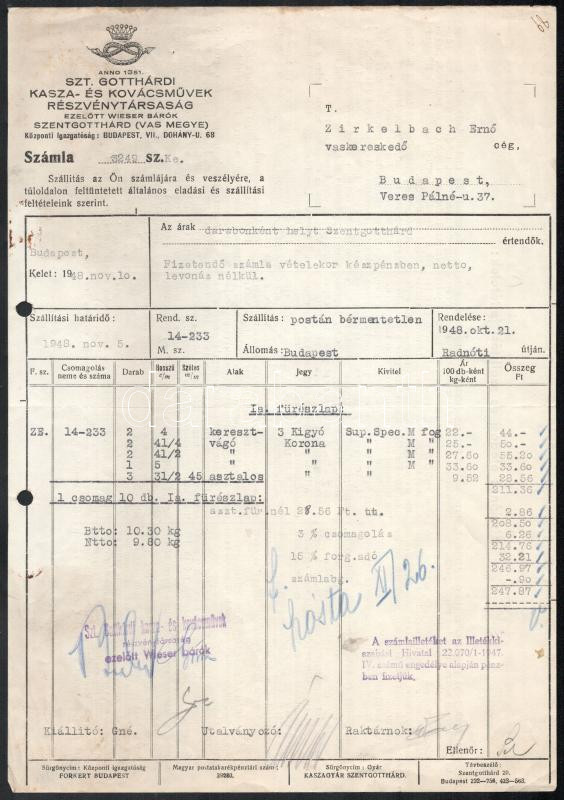 Beschreibung: 1948 Bp., Szentgotthárdi Kasza- és Kovácsművek Részvénytársaság számlája, fejléces papíron, lapszéli lyukasztással