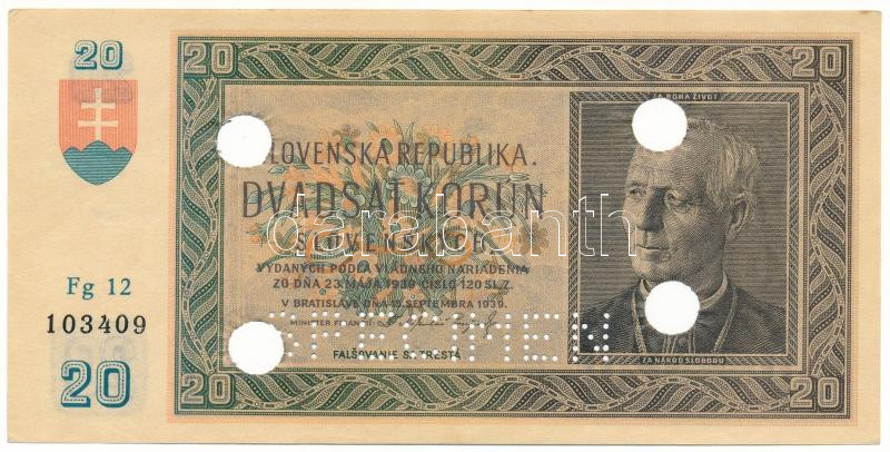 Szlovákia 1939. 20K "SPECIMEN" perforációval, "Fg 12 103409", lyukaszt... https://www.darabanth.com/de/481-Fernauktion/481.0/Numismatik/Weltweit-Banknoten~500016/Szlovakia-1939-20K-SPECIMEN-perforacioval-Fg-12-103409-lyukasztasokkal-ervenytelenitve-T-XF~II3284809