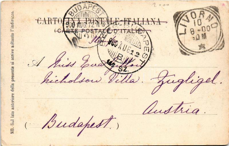 Beschreibung: 1900 Livorno, Scalo del Vecchio Porto Mediceo. Belforte / port, ships, steamship + "BÉCS- BUDAPEST 117. sz. B" vasúti mozgóposta bélyegző. TCV card (fl)