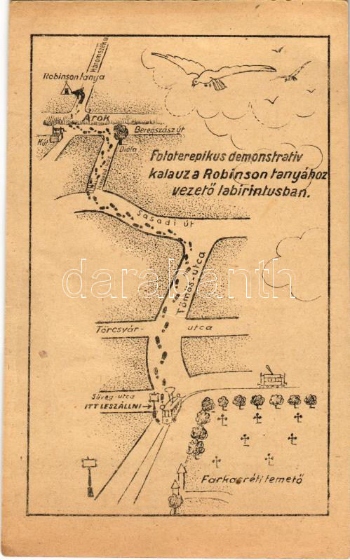Fototerepikus demonstratív kalauz a Robinson tanyához vezető labirintu... https://www.darabanth.com/de/482-Fernauktion/482.0/Ansichtskarten/Landkarte~2000099/Fototerepikus-demonstrativ-kalauz-a-Robinson-tanyahoz-vezeto-labirintusban-Hungarian-humor-map~II3294888