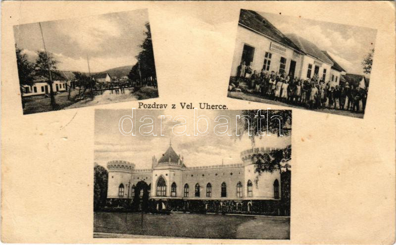 Beschreibung: 1929 Nagyugróc, Velké Uherce; Thonet kastély, utca, Bernát üzlete / castle, street, shops (tűnyomok / pin marks)
