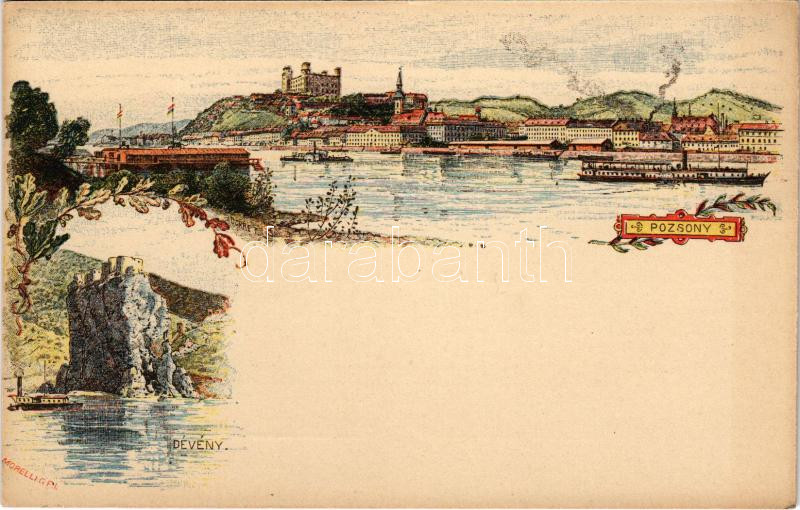 Pozsony, Pressburg, Bratislava; Ezredéves Országos Kiállítás, Dévényi vár, gőzhajók / Devín castle, steamships, general view. Hungarian Millennium Exhibition, floral litho s: Morelli, Dörre T. + barna 2 Kr. Ga.