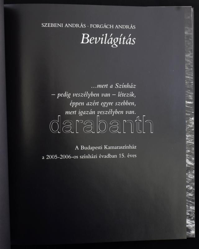 Szebeni András; Forgách András: Bevilágítás. 2005, Budapesti Kamaraszí... https://www.darabanth.com/de/482-Fernauktion/482.0/Bucher/Bucher-Andere-kuriositaten~500035/Szebeni-Andras-Forgach-Andras-Bevilagitas-2005-Budapesti-Kamaraszinhaz-kartonalt-papirkotes-~II3291489