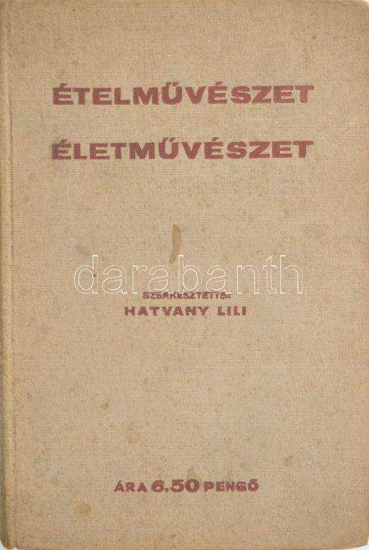 Hatvany Lili: Ételművészet, életművészet. Szerk.: - -. I. könyv: Györki Béla: Az étel művészete. II. könyv: Arthur MacGowern: Az élet művészete. Bp.,[1937],Színházi Élet,(Athenaeum-ny.), 256+32 p. Első kiadás. Kiadói egészvászon-kötés, kissé foltos