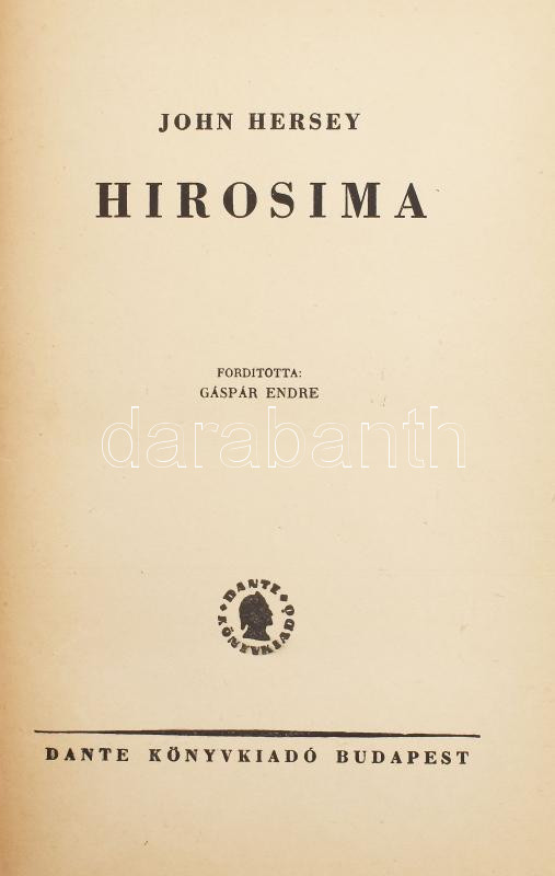 John Hersey: Hirosima. Bp., 1947, Dante. Kiadói aranyozott félvászonkö... https://www.darabanth.com/de/482-Fernauktion/482.0/Bucher/Bucher-Geschichte~500019/John-Hersey-Hirosima-Bp-1947-Dante-Kiadoi-aranyozott-felvaszonkotesben~II3261833