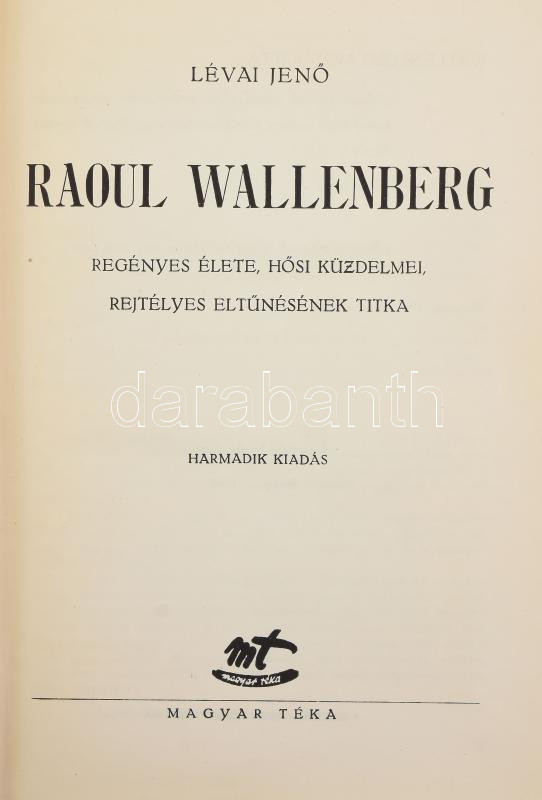 Lévai Jenő: Raoul Wallenberg regényes élete, hősi küzdelmei, rejtélyes... https://www.darabanth.com/de/482-Fernauktion/482.0/Bucher/Bucher-Geschichte~500019/Levai-Jeno-Raoul-Wallenberg-regenyes-elete-hosi-kuzdelmei-rejtelyes-eltunesenek-titka~II3297210