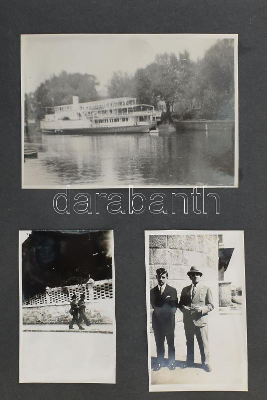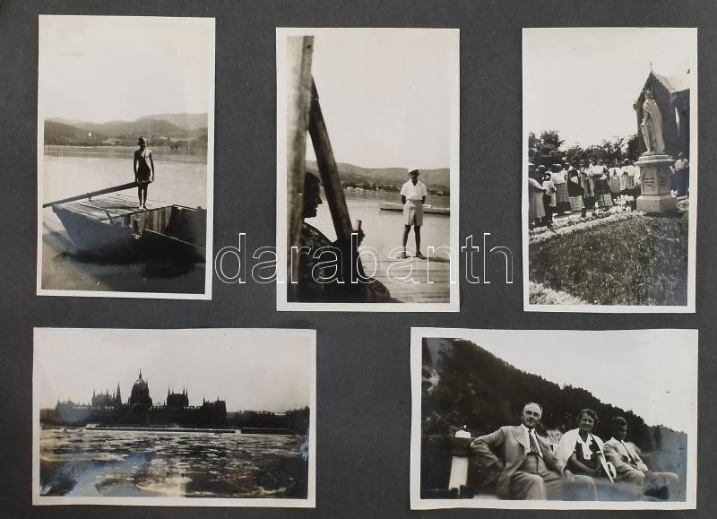 cca 1930-1940 Kisméretű fotóalbum, 62 db beragasztott fotóval a Dunakanyarról, Eucharisztikus Kongresszusról, Budapestről, 4×6 és 13×9 cm közötti méretekben
