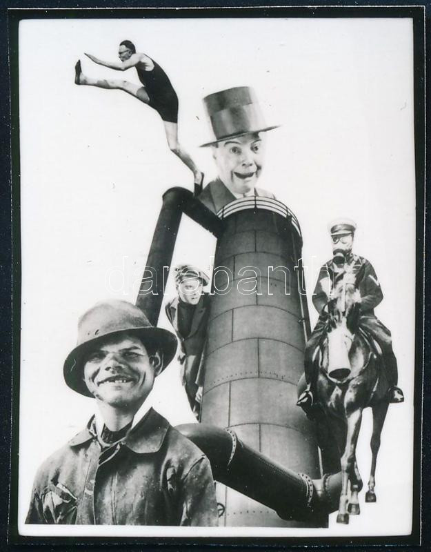 cca 1930-as 1940-es évek, ismeretlen kollázs/montázs készítő művész alkotásának későbbi prezentációja (Gyárkémény), miniatűr fotón, ezüstzselatinos fotópapíron, 4,9x3,7 cm