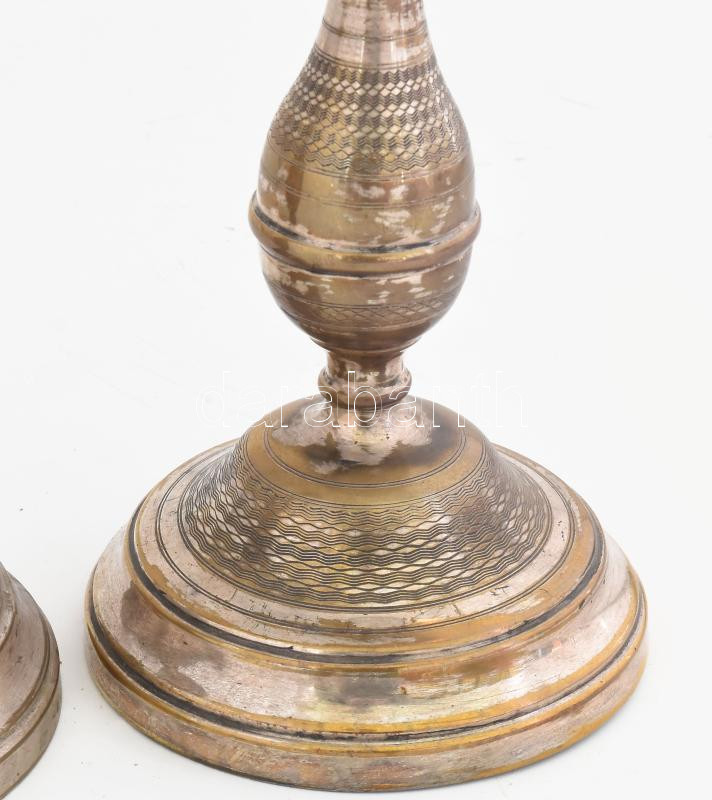 Beschreibung: cca 1930, Ezüstözött alpakka gyertyatartó pár, kopással, sérüléssel, m: 24 cm